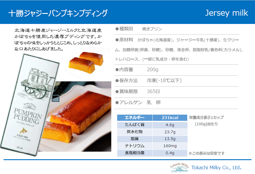 素材がよく⽣きていて北海道産かぼちゃの⽢みをしっかりと感じる濃厚なプディング。か⼝いっぱいに広がるかぼちゃとカラメルの⾹りがどこか懐かしく、癖になります。北海道⼗勝産ジャージーミルクのコクがあり上品な味わいがかぼちゃの⽢みを引き⽴てていて、後を引く美味しさです。